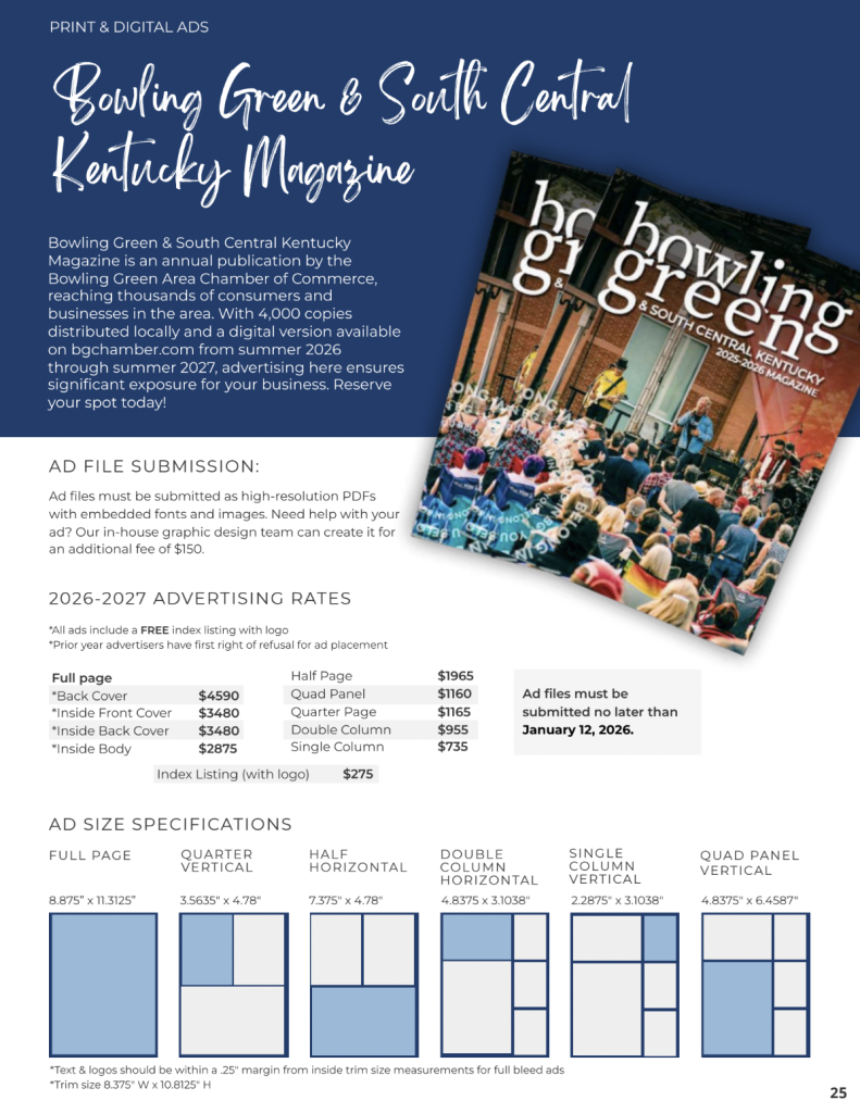 The 2026 Sponsorship Guide is a public facing marketing resource used by the Bowling Green Area Chamber of Commerce to communicate event packages, sponsorship tiers, and partnership opportunities. The goal of this project was to modernize the guide, strengthen its visual hierarchy, and make it easier for businesses to quickly understand the value of each offering.