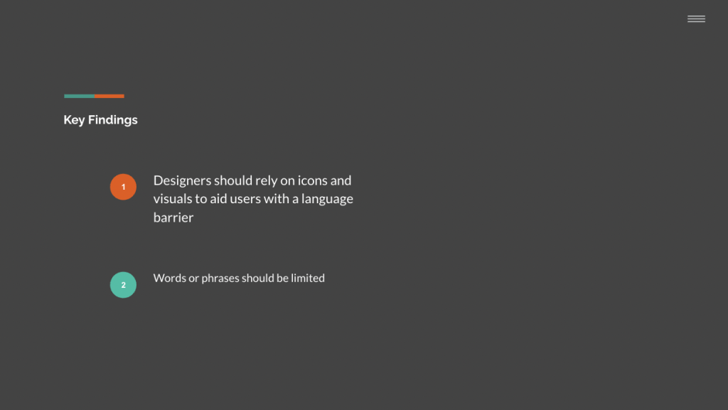 Mapped out what users would need to understand in a very short amount of time and identified points where language could become a barrier
